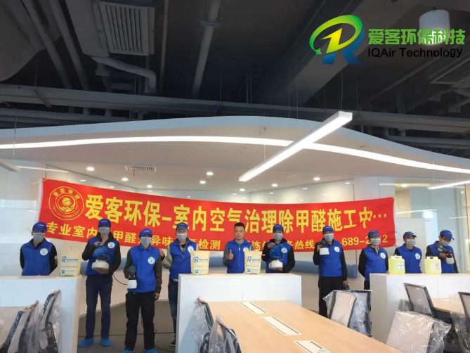 施工人員針對辦公區(qū)墻面、天花、地面、地毯、柜體、家具物表逐一噴灑愛洛客復(fù)合光觸媒和高分子生物酶,以消除異味分子,降解甲醛及TVOC。