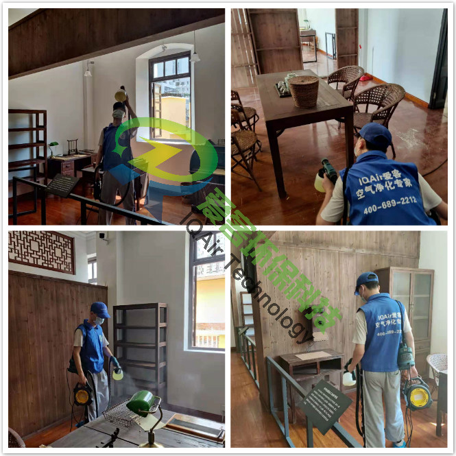 愛客工程師們對紀(jì)念館一、二樓展區(qū)地板、墻面、翻新門窗表面逐一噴灑愛客濃縮型異味分解酶(食品級)與強(qiáng)力TVOC清除劑(食品級),以消除化學(xué)異味分子,降解甲醛及TVOC。并結(jié)合紫外線燈進(jìn)行殺菌消毒治理。